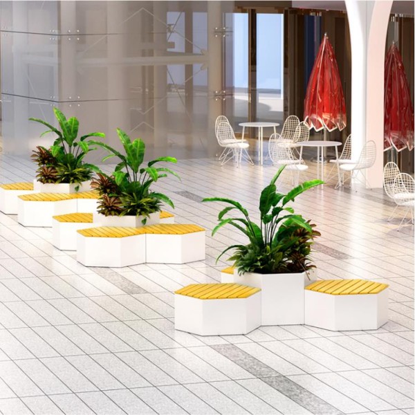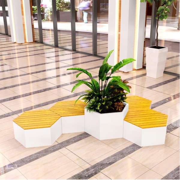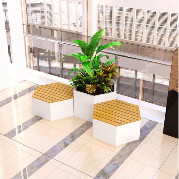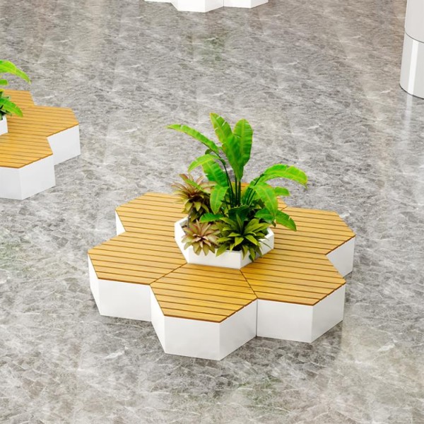不锈钢防腐木六边形坐凳创意景观艺术休闲椅适用于现代豪华建筑装饰,其产品造型新颖独特、美观大方、坚固耐用、不易破碎。